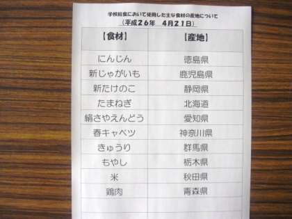 メモは、春野菜のうま煮に使われている野菜についてです。それぞれの野菜には旬があります。旬とは、その野菜の栄養がたっぷり詰まっていて、一番おいしく食べることができる時期のことです。今日は、うま煮に今が旬の野菜を3種類使っています。一つめは、たけのこ、二つめは、じゃがいも、三つ目は、きぬさや(さやえんどう)です。おいしく、栄養もたっぷり詰まった旬の野菜をぜひ味わってください。