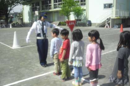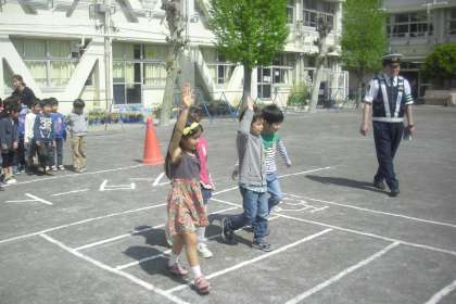 警察の方に来ていただき、信号の渡り方、道路に車が止まっているときの歩き方などを教えていただきました。
