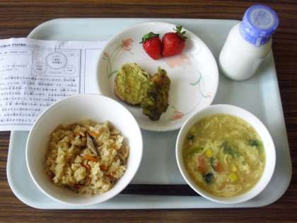 今日は、中華おこわ、牛乳、煎茶揚げ(さつまいも・ちくわ)、コーンとたまごのスープ、いちごです。