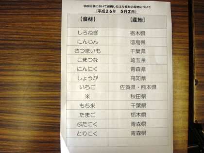 今日は、2つの行事を取り入れた献立となっていますが、何の行事かわかりますか。1つは、5月5日の端午の節句です。この日は、男の子の健やかな成長を願ってちまきを食べます。山野小では、1000人分のちまきを作るのは少し難しいので、ちまきの中身である中華おこわを取り入れました。もう1つの行事は、5月2日本日の八十八夜です。この日は、立春(暦のうえで春が始った日)から88日目で、この日にお茶を飲むと長生きすると言われています。そこで今日は、みなさんの長生きを祈り、お茶の葉を天ぷらの衣に入れた煎茶揚げを作りました。新しい献立です。