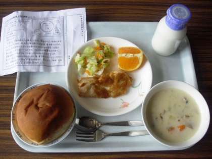 今日は、スライス丸パン、牛乳、鳥肉のバーベキューソース、ボイル野菜、森のチャウダーです。