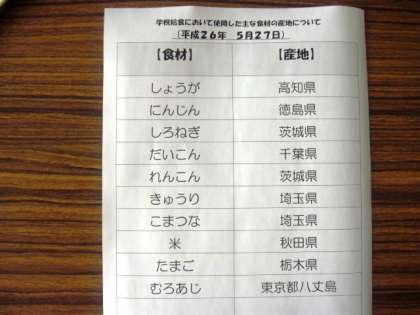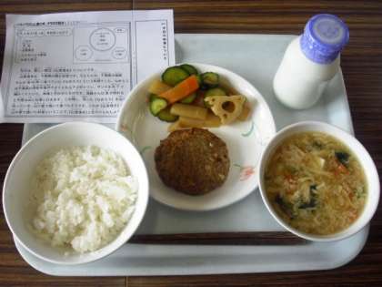 今日は、ごはん、牛乳、さんが焼き、シャキシャキ野菜、かきたま汁です。