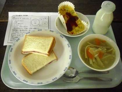 今日は、ジャムバターサンド、牛乳、スペイン風オムレツ、ヌードルスープです。
