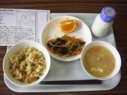 今日は、とりめし、牛乳、華風和え、豚汁、清見オレンジです。