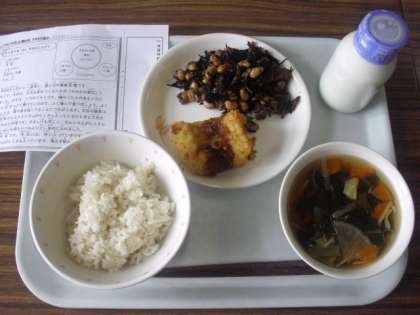 今日は、ごまごはん、牛乳、イカフライ、大豆の磯煮、すまし汁です。