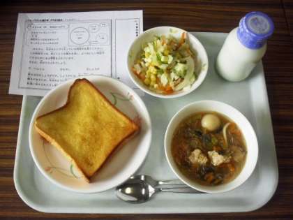 今日は、はちみつレモントースト、牛乳、肉団子入り春雨スープ、チーズ入りフレンチサラダです。