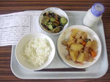 今日は、ごはん、牛乳、じゃがいものそぼろ煮、梅ドレッシングサラダです。