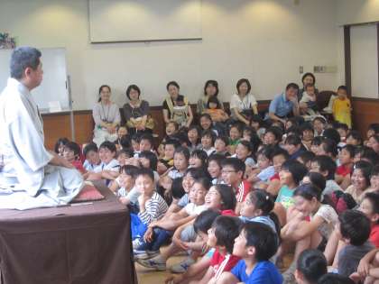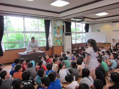 国語の学習の一環として噺家の三遊亭右左喜さんをお招きし、落語の鑑賞をしました。たくさんの小咄を聞き、笑い声が絶えませんでした。ただ楽しいだけでなく、話し方や間のとり方、手ぬぐいと扇子を使った表現についても教えていただき、とても有意義な学習になりました。学んだことを基に、各学級で落語発表会を行い学習のまとめをしていきます。