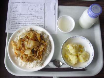 今日は、キムチ丼、牛乳、コーンポテト、ホワイトゼリーです。