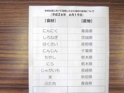 メモは、キムチ丼のごはんについてです。みなさんは、今日のごはんがいつものように真っ白でないことに気がつきましたか。これは、麦を混ぜているからです。麦は、真ん中に茶色い筋が入っています。昔は、白いお米が高級だったので、それを買うことのできない人がお米の代わりに麦を食べていましたが、今は、その麦に栄養がたっぷり入っていることがわかり、積極的に食べるようになりました。その主な栄養は、食物繊維とビタミンB1です。どちらも白いお米には、ほんの少ししか入っていません。ビタミンB1は体の疲れをとる働きもあります残さず食べて元気に過ごしましょう。