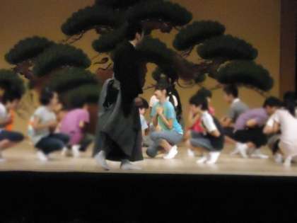 鑑賞に先立ち、ワークショップがありました。山野小学校からも代表5名が舞台に上がり、狂言師の方々から独特の動きや言い回しを教えていただきました。