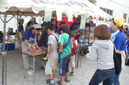 模擬店は、砧町自治会のヨーヨーつり、砧町町会・おやじネットのわたあめ、かき氷、ポップコーン、砧工房のくずもちなど全部で22店舗もありました。来場者数推定2000名ということもあり、どのお店も売り切れ続出です。