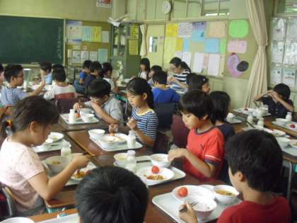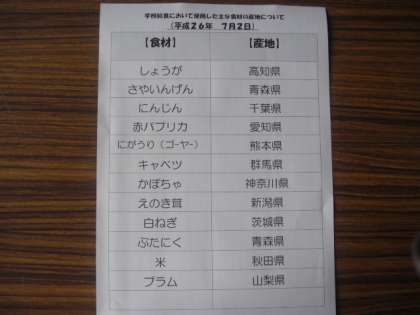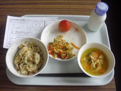 今日は、沖縄県の用度料理を取り入れた献立です。沖縄には独特の方言があり、今日の献立「シシジューシー」と「ゴーヤーチャンプルー」もその一つです。シシジューシーのシシは、豚肉、ジューシーは炊き込みごはんを指すので「シシジューシー」は「豚肉の炊き込みごはん」という意味です。また、色々な物を混ぜるという意味のチャンプルーという言葉を使った「ゴーヤーチャンプルー」は、「ゴーヤーと色々なものを混ぜた料理」を指します。ぜひ、残さず食べてください。