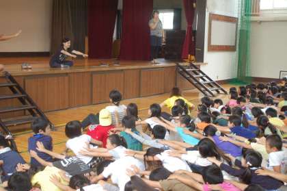 今日は体育館で体育朝会を行い、今年度から取り組んでいる『ちょこっと運動』を紹介しました。今日、紹介したのは『ちょこっとヨガ』です。体側を伸ばしたり、木のポーズでバランスをとったりとみんなでヨガを体験しました。初めて経験をした子も多かったようで、みんな真剣に取り組んでいました。今後も『ちょこっと運動』を全校に広げ、少しの時間で体を動かす楽しさを味わわせていきます。