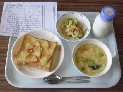 今日は、アップルトースト、牛乳、ビーンズサラダ、コーンとたまごのスープです。