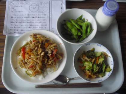 今日は、チンジャオロースー丼、牛乳、ゆで枝豆、大根と昆布の中華サラダです。