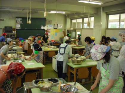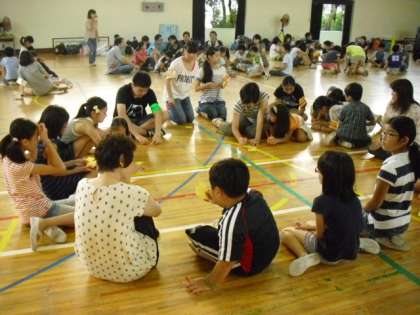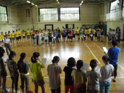 スタッフに100名、参加者が150名でスタートしました。家庭科室では、PTA・地域の皆さんや教職員を中心にカレー作りが始まりました。体育館では、開所式の後、交流ゲームを行いました。