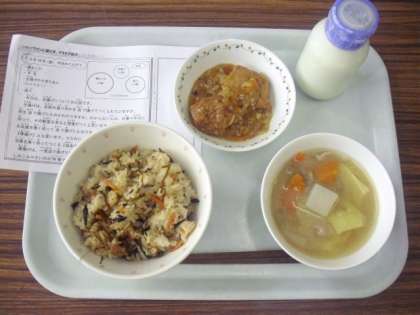 今日は、磯おこわ、牛乳、生揚げのそぼろあん、豚汁です。