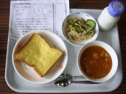 今日は、フレンチトースト、牛乳、ビーンズシチュー、ツナサラダです。