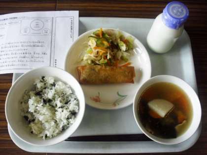 今日は、わかめごはん、牛乳、春巻き、野菜の甘酢かけ、かぶのスープです。