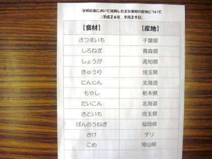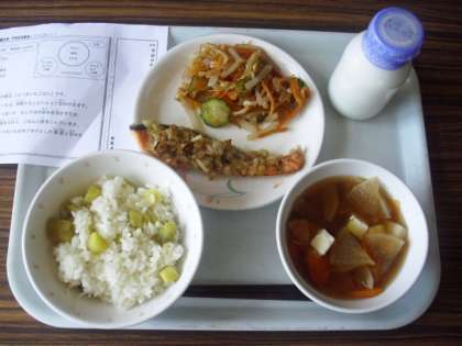 今日は、さつまいもごはん、牛乳、鮭のねぎみそ焼き、こんにゃくサラダ、けんちん汁です。
