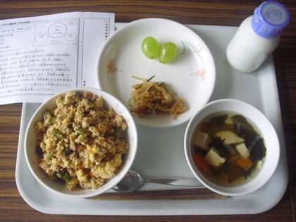 今日は、四色そぼろ丼、牛乳、ハリハリ漬け、若竹汁、マスカットです。