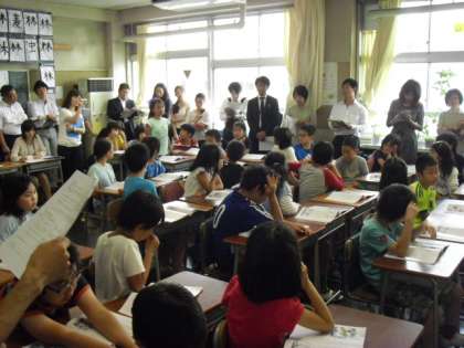 山野小学校が会場となり、2つの研究授業が行われました。1つが、4年2組根本先生の道徳部「なによりも尊いもの」と、もう1つが、6年4組原口先生の教育相談部(道徳)「平和について考えよう」です。世田谷の先生方に、山野小学校の子どもたちと先生方も「一生懸命」に頑張っている姿を見ていただきました。授業の後、協議会で意見を出し合い、研究をより深めました。
