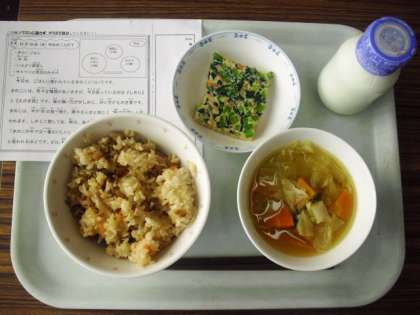 今日は、きのこごはん、牛乳、いろどり卵蒸し、キャベツとかぼちゃのみそ汁です。