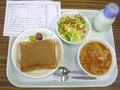 今日は、きな粉バタートースト、牛乳、ボルシチ、サラダ、ぶどう(かいじ)です。