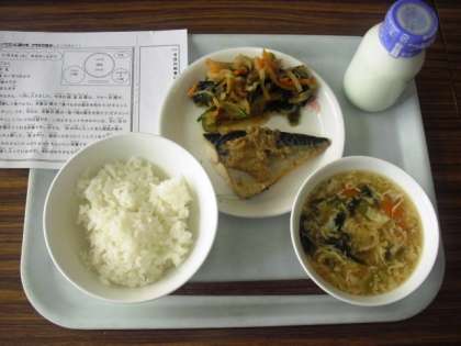 今日は、ごはん、牛乳、魚のごまだれかけ、和風サラダ、かきたま汁です。