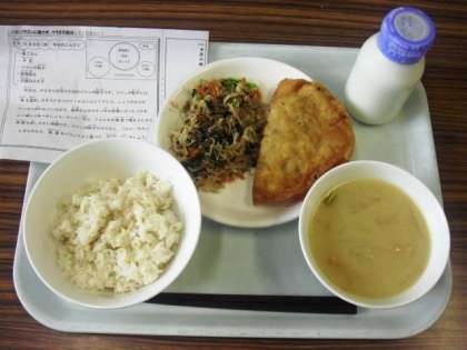 今日は、麦ごはん、牛乳、ジャンボ餃子、乾物和え、大根のみそ汁です。