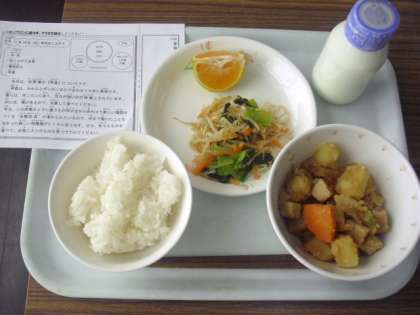 今日は、ごはん、牛乳、肉じゃがうま煮、華風あえ、早香(はやか)です。