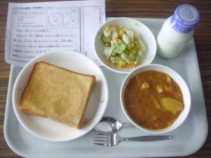 今日は、シナモントースト、牛乳、ビーンズシチュー、チーズ入りフレンチサラダです。