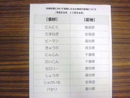 メモは、新しい献立ヴィシソワーズについてです。このヴィシソワーズとは、フランス語でヴィシー風スープという意味です。昔、フランスのヴィシーというとこで育った料理人が考えたスープなので、この名前がつきました。じゃがいもをたくさん使ってとろみをつけ、生クリームでコクを出すのが特徴です。本来は、冷やして食べるスープですが、今日は、温かいスープとしていただきます。お味はいかがですか。