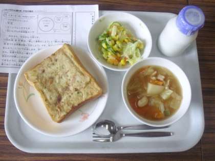 今日は、ツナポテトトースト、牛乳、コーンフレンチサラダ、白いんげん豆の田舎風スープです。