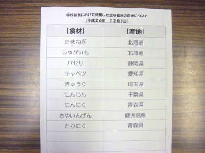 みなさん、今日から12月です。12月の給食目標は、“楽しく食事をしよう”と“寒さに負けない体をつくる栄養の取り方を知ろう”です。今日は、“楽しく食事をしよう”についてお話します。学校での食事は、一人でしません。友達や先生と一緒です。大勢での食事を楽しむためには、自分だけが楽しいだけではいけません。周りの人も楽しく食事ができるように話題を選んだり、食事のマナーを守ったりと、周りの人への気遣いも必要です。みなさんは、できていますか。