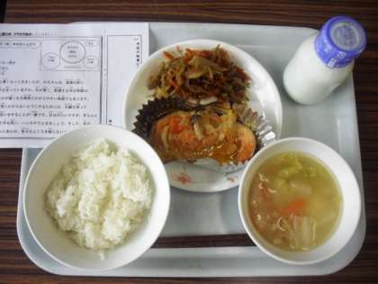 今日は、ごはん、牛乳、鮭のみそバター焼き、きんぴらごぼう、白菜のみそ汁です。