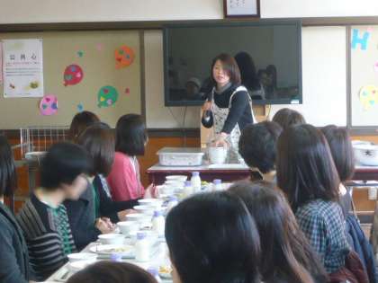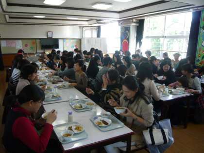ランチルームで給食試食会を行いました。ついついおいしさだけに目が行きがちですが、給食について、栄養面、食習慣、食の安全、食文化、いただきますの精神、食料の流通・・・と、たくさんのことを学び、考えるきっかけとなりました。その後は、もちろん給食をおいしく試食をしました。磁器製の食器の重さも実際に手にしないと分かりませんね。ご参加ありがとうございました。