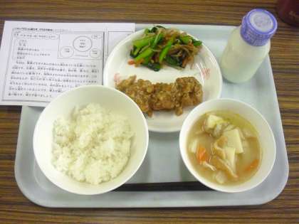 今日は、ごはん、牛乳、生揚げのそぼろあん、野菜のからしじょうゆかけ、野菜の五目汁です。