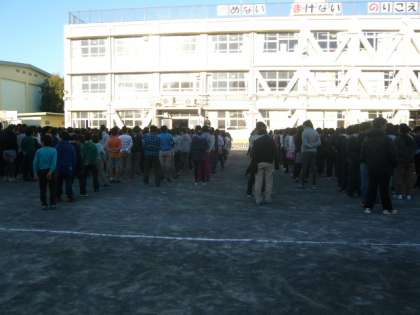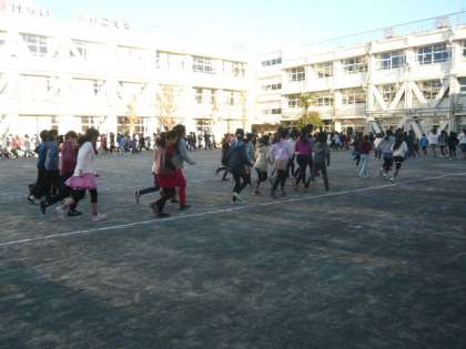 今日は体育朝会がありました。これから休み時間にも行われる「持久走タイム」の説明を聞き、実際に走ってみました。子どもたちは寒い中でしたが元気いっぱい走っていました。