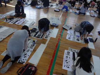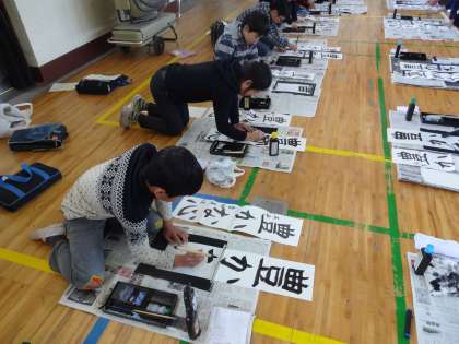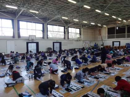 9日(金)の3・4時間目に6年生、5・6時間目に5年生が体育館で「書初め大会」を行いました。
