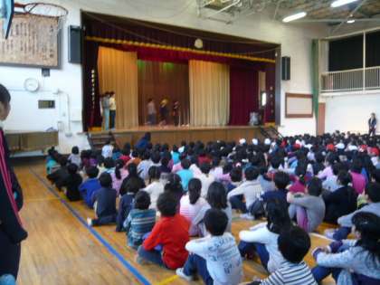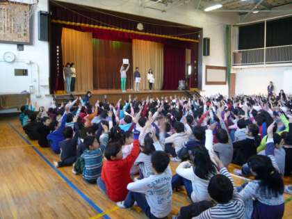 今朝は体育館でゲーム集会がありました。「あの人は何番目!?」クイズです。ステージの上を特徴のある7人が通り、問題になった人が何番目に通ったかを当てるというルールです。問題が難しくなるとともに子どもたちも迷いながら盛り上がりました。