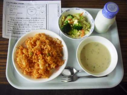今日は、チキンライス、牛乳、ブロッコリーのサラダ、ビシソワーズです。