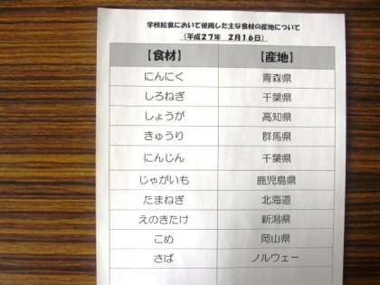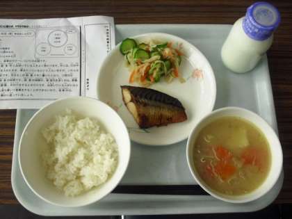 今日は、ごはん、牛乳、魚の七味焼き、はりはり酢のもの、じゃがいものみそ汁です。