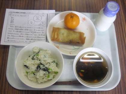 今日は、なめし、牛乳、春巻き、若竹汁、ぽんかんです。