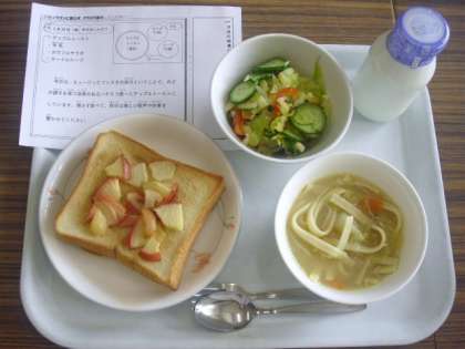 今日は、アップルトースト、牛乳、カラフルサラダ、ヌードルスープです。