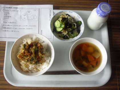 今日は、かき揚げ丼、牛乳、わかめの酢の物、けんちん汁です。