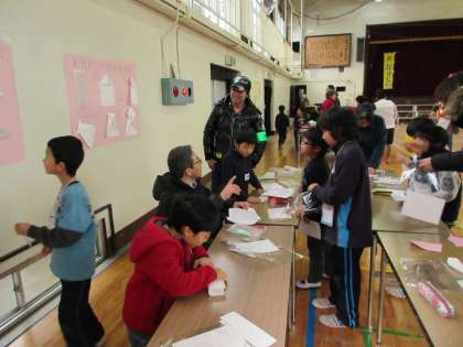 ただ今、体育館でおやじネット主催の紙ヒコ—キ大会が行われています。最初に飛ばしたときは全然飛ばないかった子も遠くに飛ばすコツ「銀の伝授」を受けて、5メートル、10メートルと遠くまで飛ぶようになりました。今は、「金の伝授」を教わっています。「自分の記録に勝つ!」を目標にどこまで記録は伸びるのでしょうか。