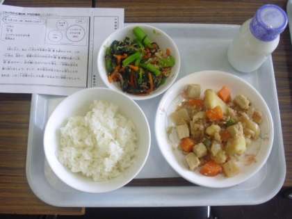 今日は、ごはん、牛乳、じゃがいものそぼろ煮、乾物あえです。