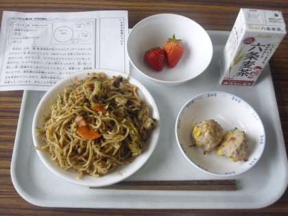 今日は、ソース焼きそば、麦茶、コーン団子、いちごです。